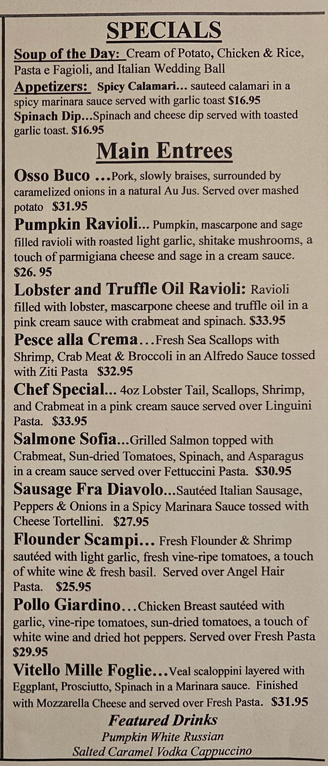 Nothing appeals to you this week? No worries! We have a vast array of items on our regular menu. Choose from assorted appetizers, salads, soups, entrees, and desserts plus various alcoholic or non-alcoholic beverages. We even have options for bambinos 12 years old and younger.
